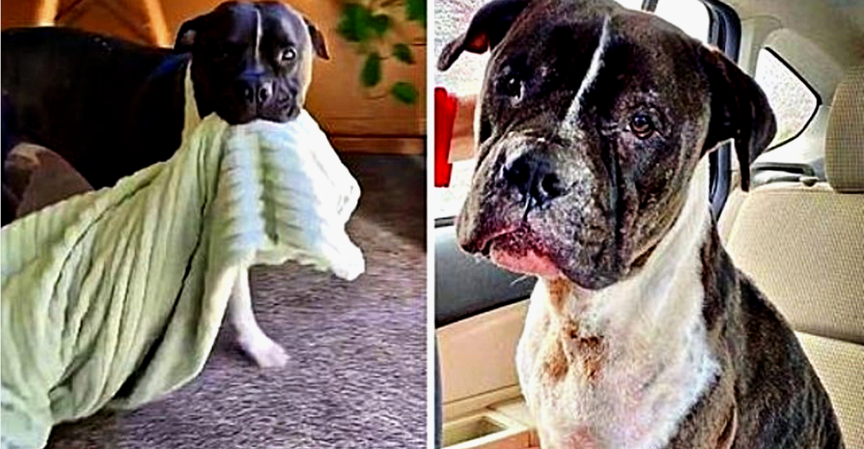 Dog Carries His Security Blanket Everywhere After Getting Saved From A Fighting Ring